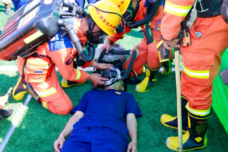 “进入现场,发现伤员……”“伤员左小腿受伤,请携带设备救援!”心肺复苏和现场急救环节,环境评估、呼唤伤员、检查呼吸、心肺复苏、指压止血、螺旋反折包扎、搬运伤员……参赛选手操作流畅、一气呵成,展现出扎实基本功、规范流程和良好团队协作。“装备”“齐全”“仪器”“完好”,小队长与队员间的铿锵对话拉开了模拟救灾环节,此次模拟矿山井下巷道电缆起火,1名工人被困,小队长担任指挥员,带领5名队员组成救援队实施救援,从接警到施救,全程反应迅速、处置专业,“快、准、稳”的应急救援能力展现的淋漓尽致,充分体现“快速响应、科学指挥、高效协同、精准救援”的理念。