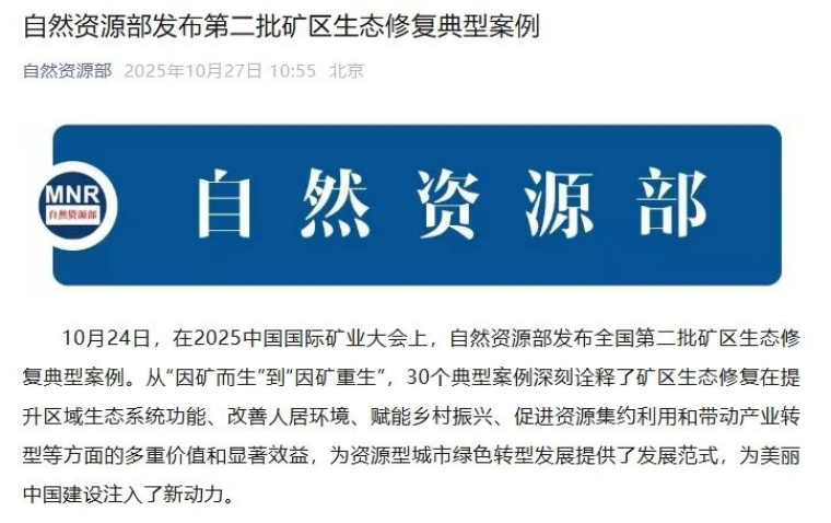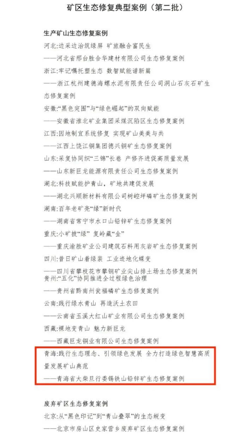 10月24日,在2025中国国际矿业大会上,自然资源部发布全国第二批矿区生态修复典型案例。锡铁山铅锌矿凭借出色的矿区治理成果,成功入选自然资源部发布的第二批矿区生态修复典型案例,成为青海乃至全国矿业企业践行 “绿水青山就是金山银山” 理念的生动范本。
