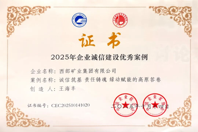 此次入选企业诚信建设优秀实践案例,不仅是对公司长期以来在诚信经营、社会责任、企业管理等多方面突出表现的高度认可,更是对公司诚信建设工作的权威认证。西部矿业将倍加珍惜这份荣誉,以此为新起点,持续深化企业诚信建设,将诚信理念全面融入战略规划、日常运营及文化内核,致力打造国内矿业领域企业诚信建设典范,为推进社会信用体系高质量发展贡献更多“西矿力量”。