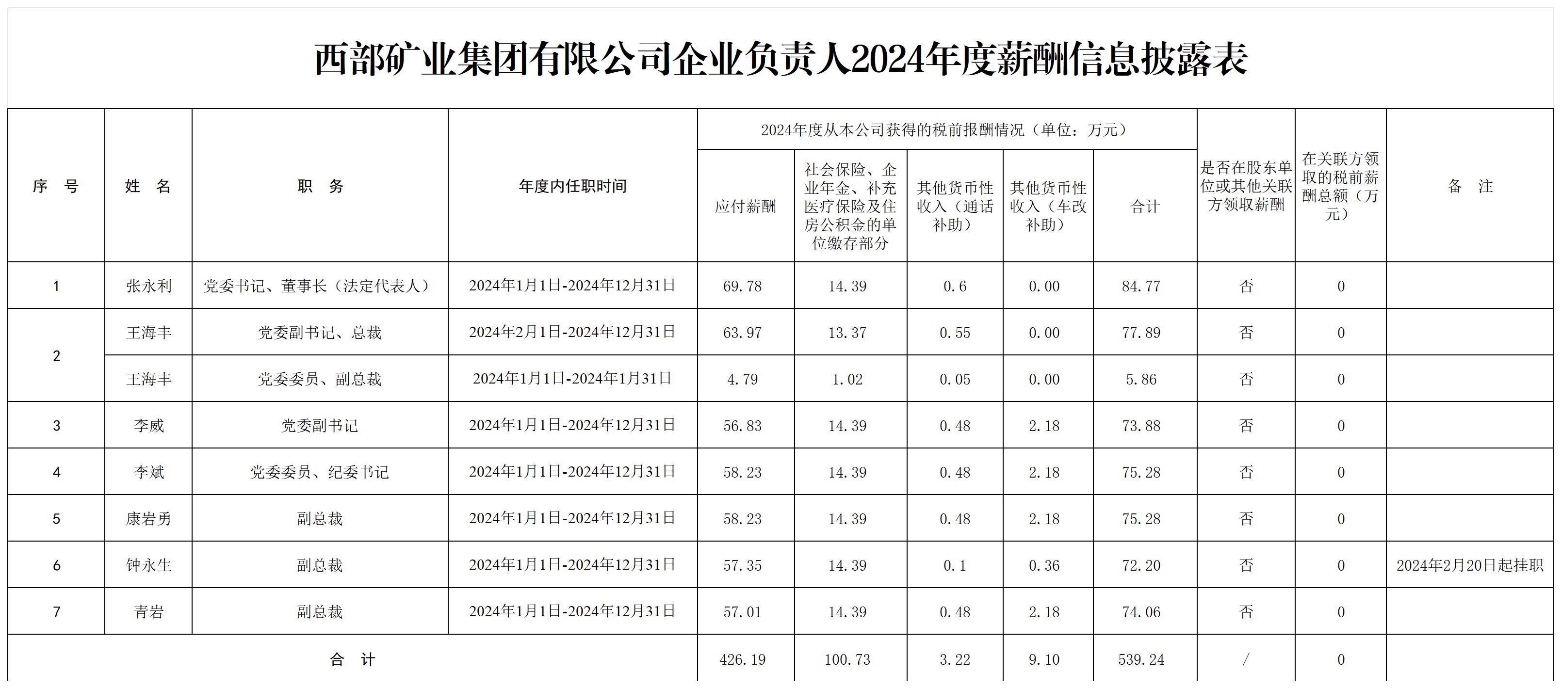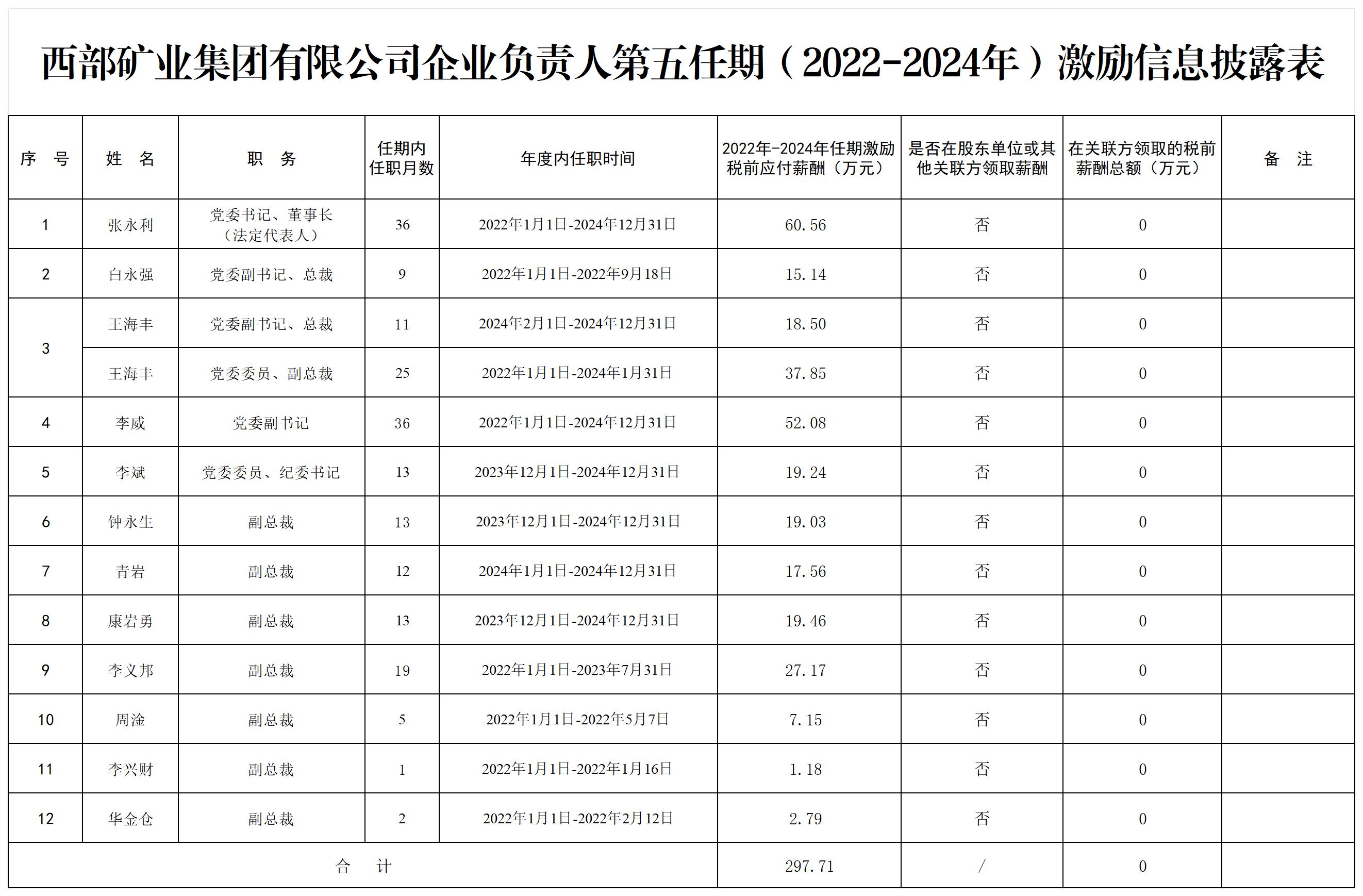 根据《青海省国资委关于西部矿业集团有限公司负责人2024年度和第五任期(2022-2024年)经营业绩考核结果及薪酬兑现的通知》(青国资考〔2025〕158号)文件规定,西部矿业集团有限公司2024年度经营业绩考核评级为A级,第五任期经营业绩考核评级为A级。西部矿业集团有限公司企业负责人2024年度薪酬兑现标准为69.78万元,其中基本年薪17.8万元,绩效年薪51.98万元;第五任期激励收入兑现标准为60.56万元。严格按照考核结果兑现企业负责人2024年度薪酬及第五任期激励收入,具体情况如下: